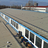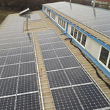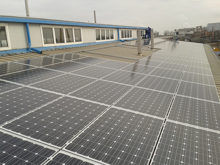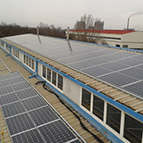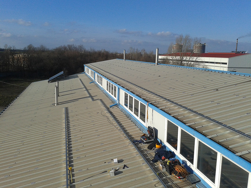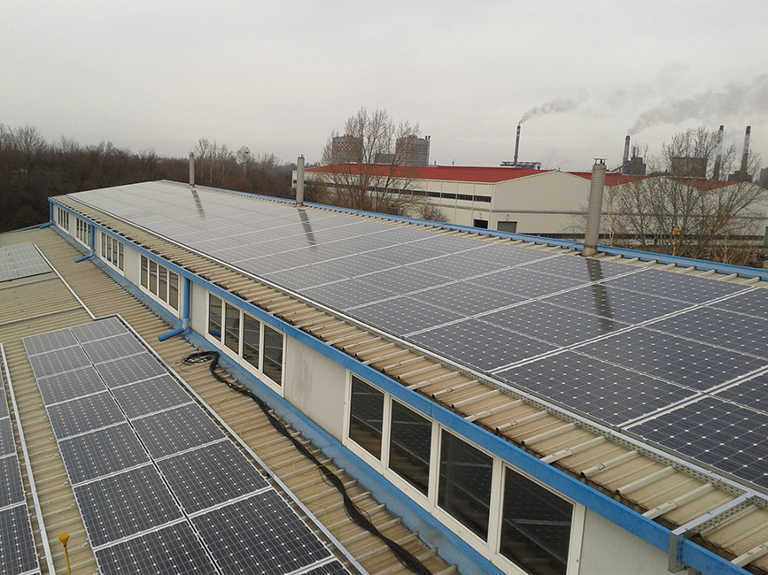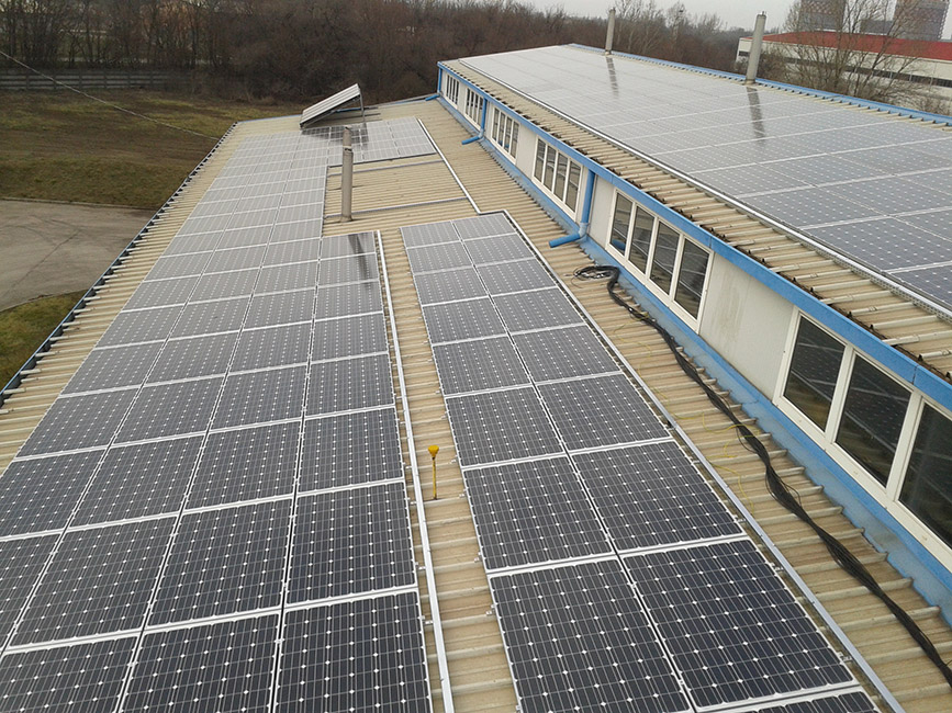 A Dunagép Zrt. dunaújvárosi üzemcsarnokára telepítettünk egy 49,49 kWp beépített teljesítményű rendszert. Az üzemcsarnok tetőszerkezete szendvicspanel rendszerű, a tető osztott. Összesen 202 db Korax Solar KS 245P típusú polikristályos napelem modul került telepítésre. A tetőszerkezet dőlésszöge az áramtermelés szempontjából nem volt ideális, ezért a modulok speciális tartószerkezettel kiemelésre kerültek, hogy biztosítható legyen az energiahozam szempontjából optimális dőlésszög. A modulok elhelyezésénél figyelembe kellett venni a tetőszerkezeten található kémények árnyékoló hatását. A csatlakozási teljesítmény 48 kW, a beépített inverter: Fronius CL 48.