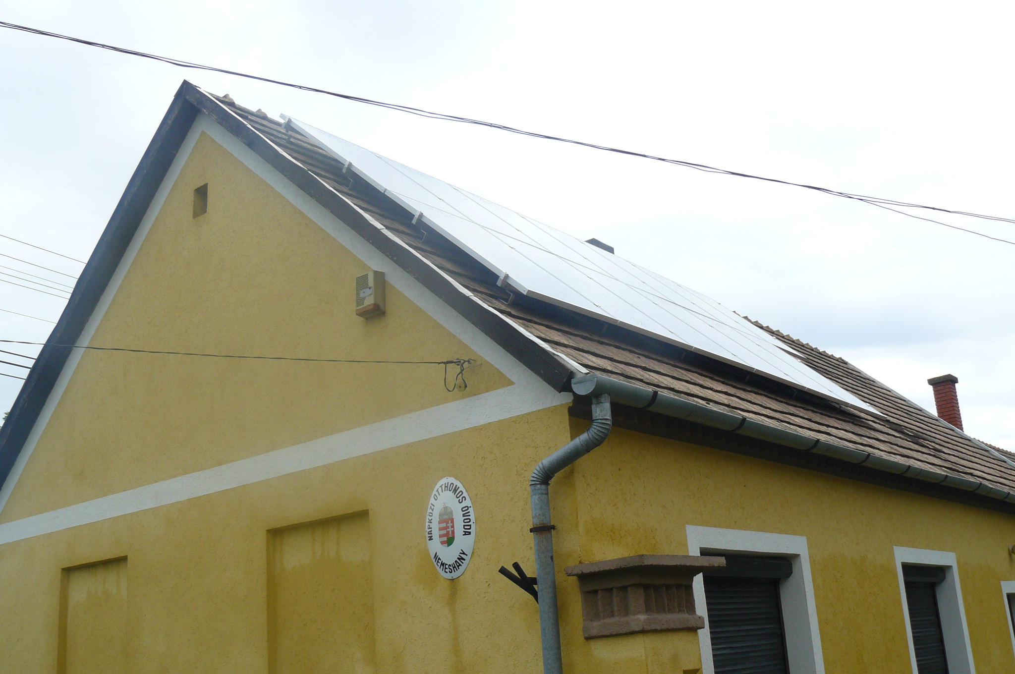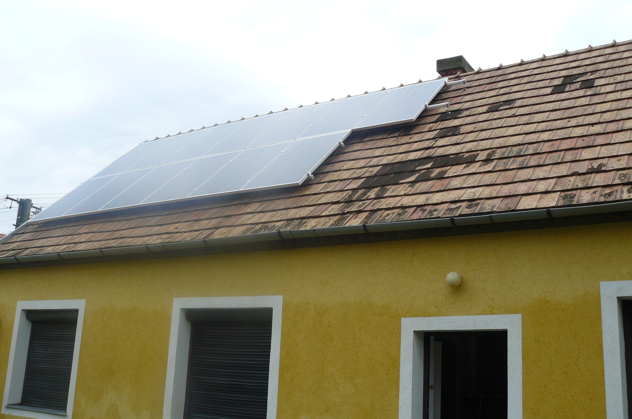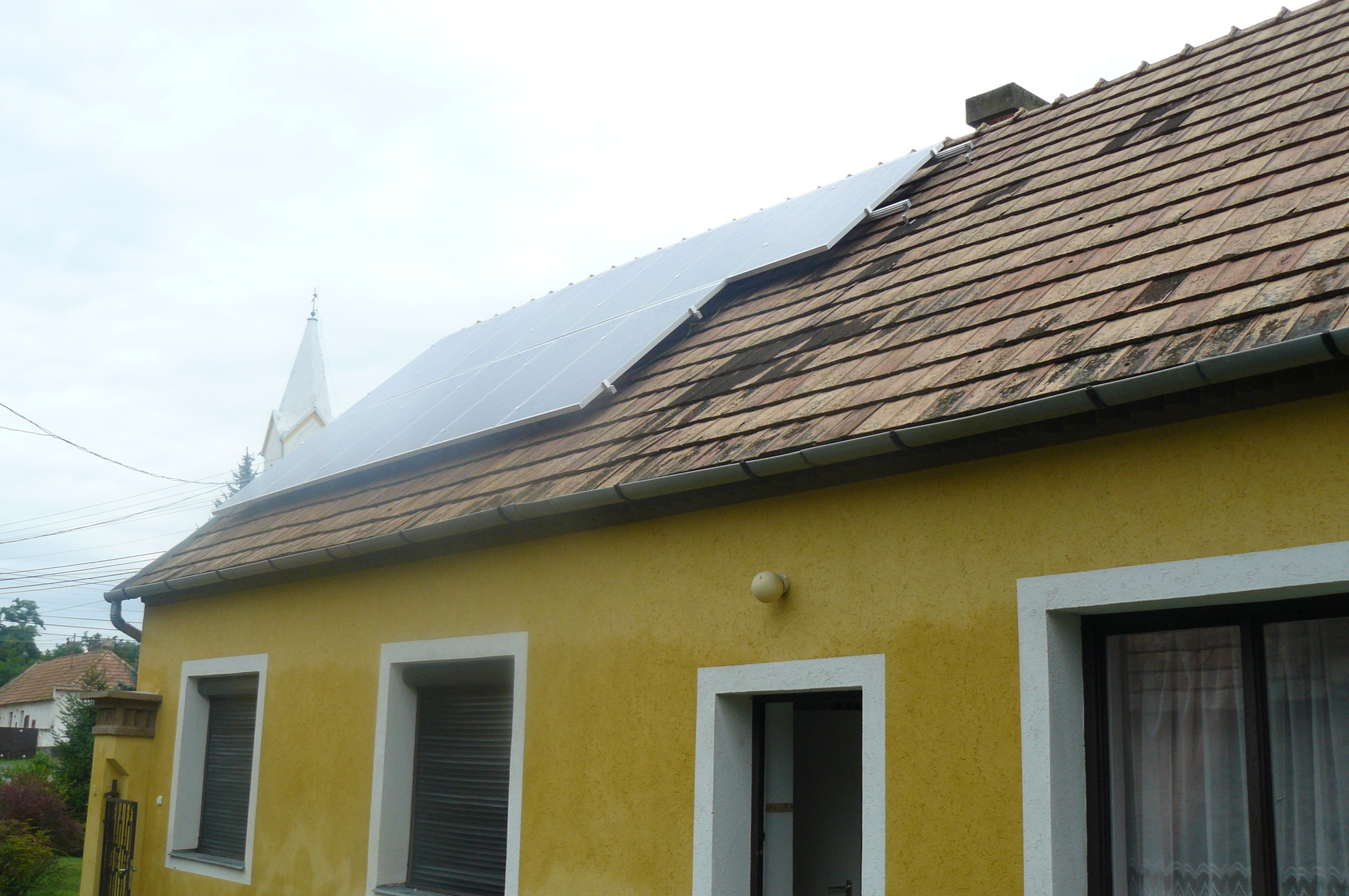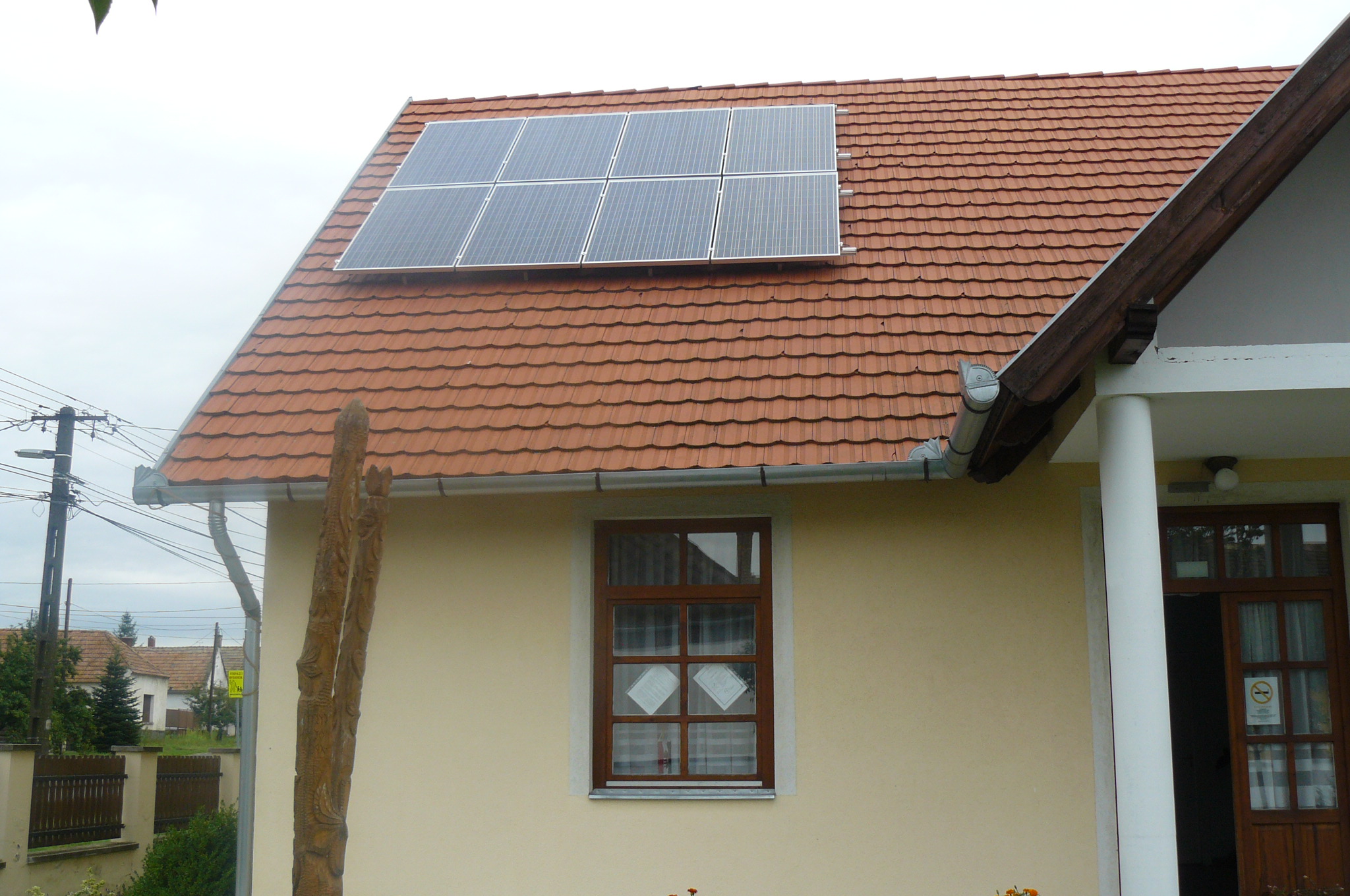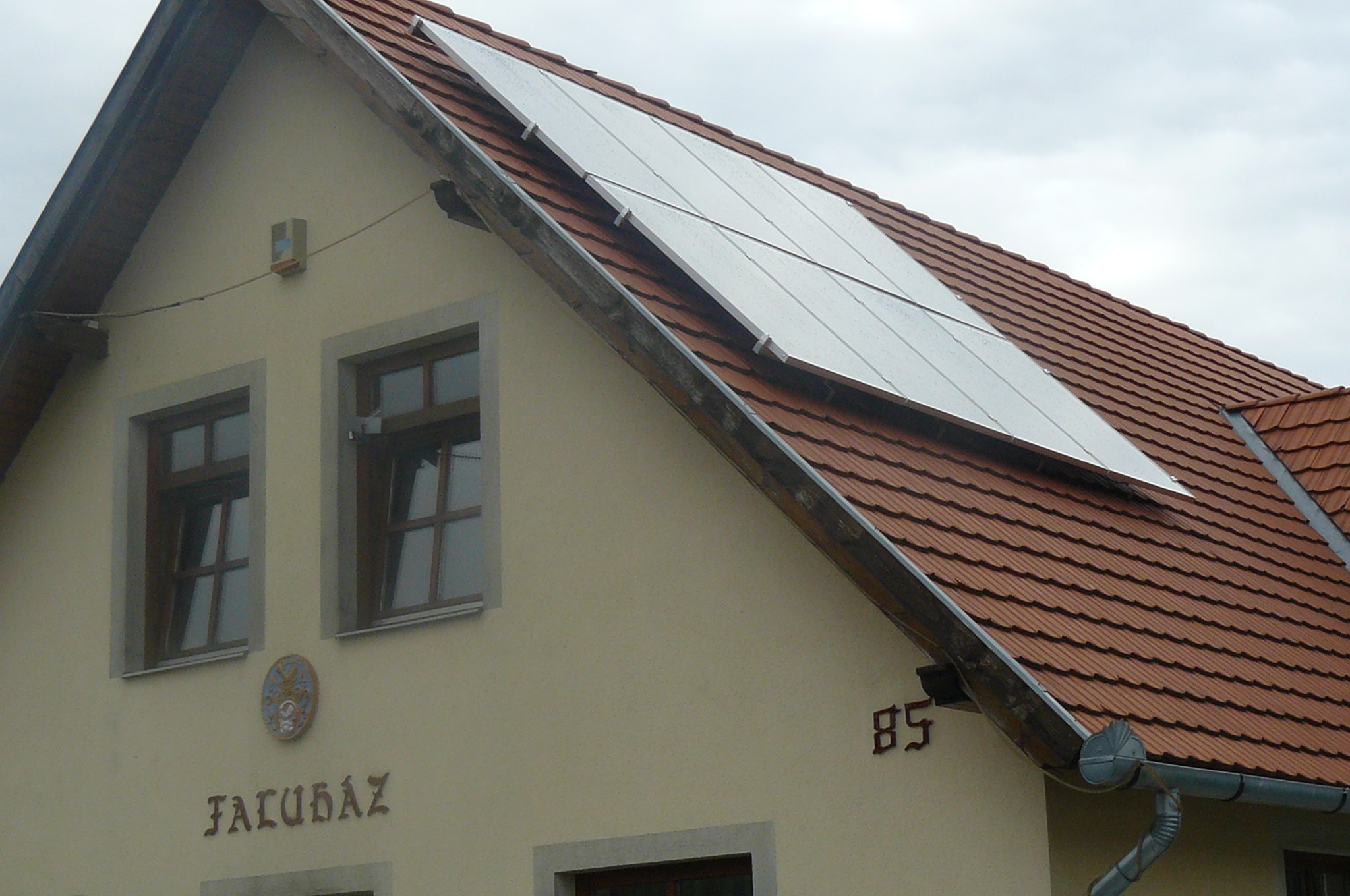 Faluház. A napelemes rendszer összesen 8 db Korax KS 245 polikristályos napelem modult tartalmaz, a beépített teljesítmény 1,96 kWp.